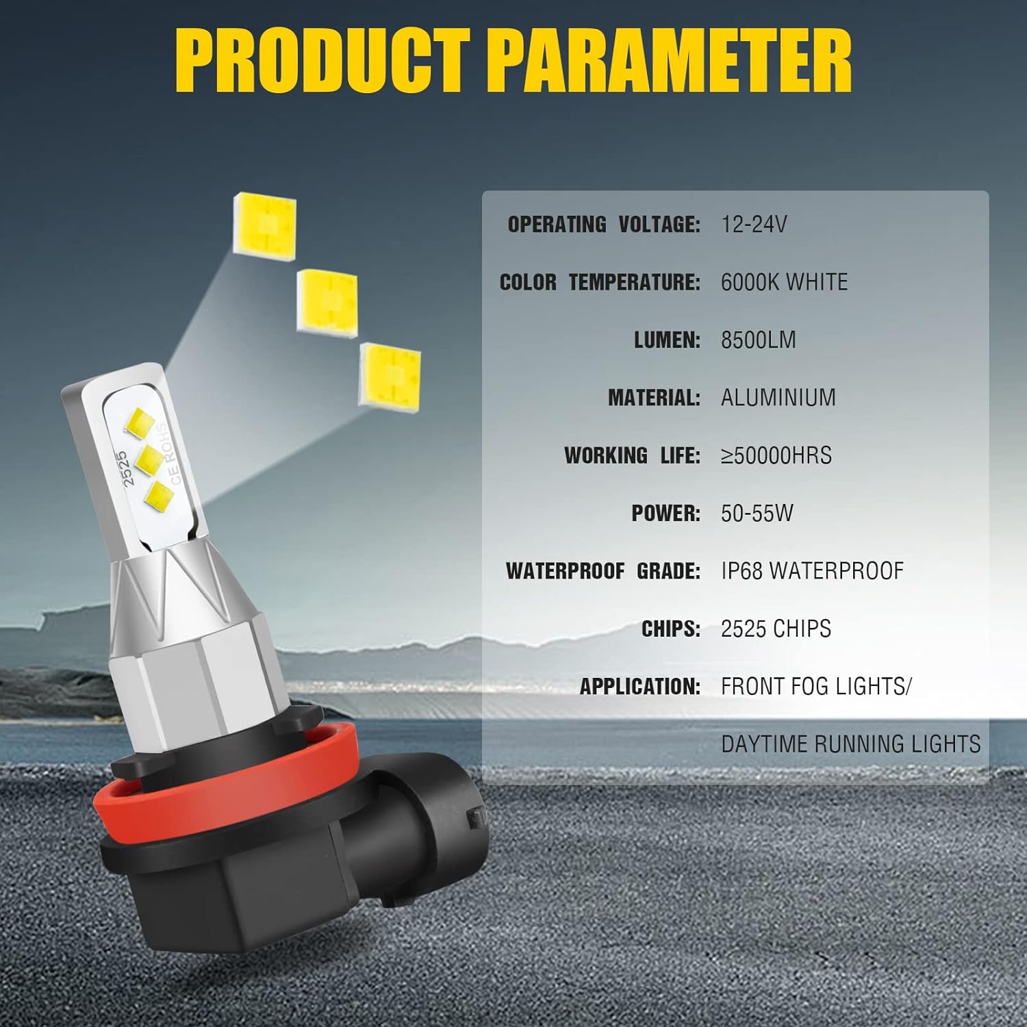Color Temp:6000K pure white;Lumens:20000LM;Power:75W;Working voltage: 12V-24V;Lifespan:≥50000hrs