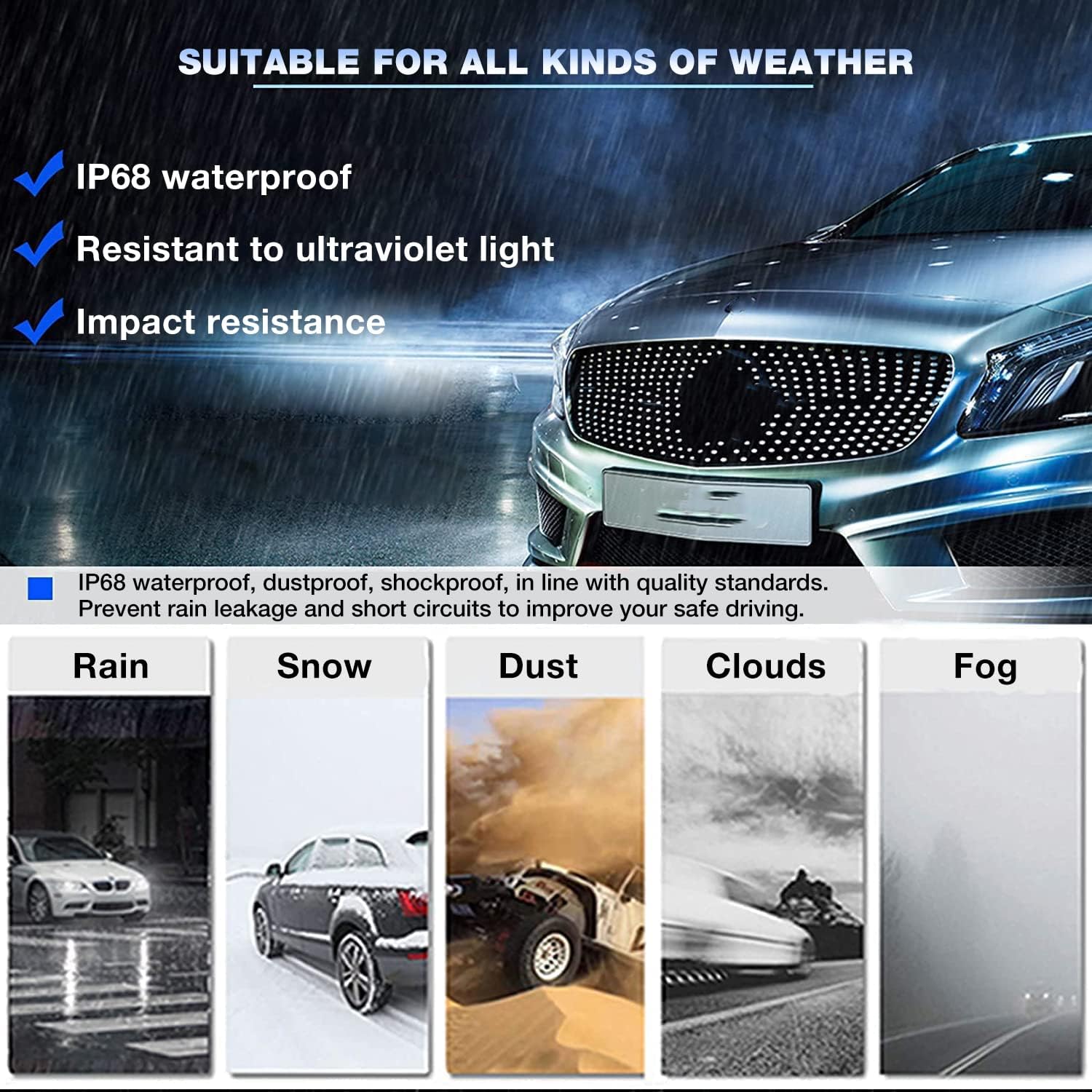 Waterproof, Shockproof and DurableWaterproof grade IP68, can adapt to rain, fog, cloudy weather. The metal bracket base reduces the impact of the car on the irregular path leading to the headlights. |