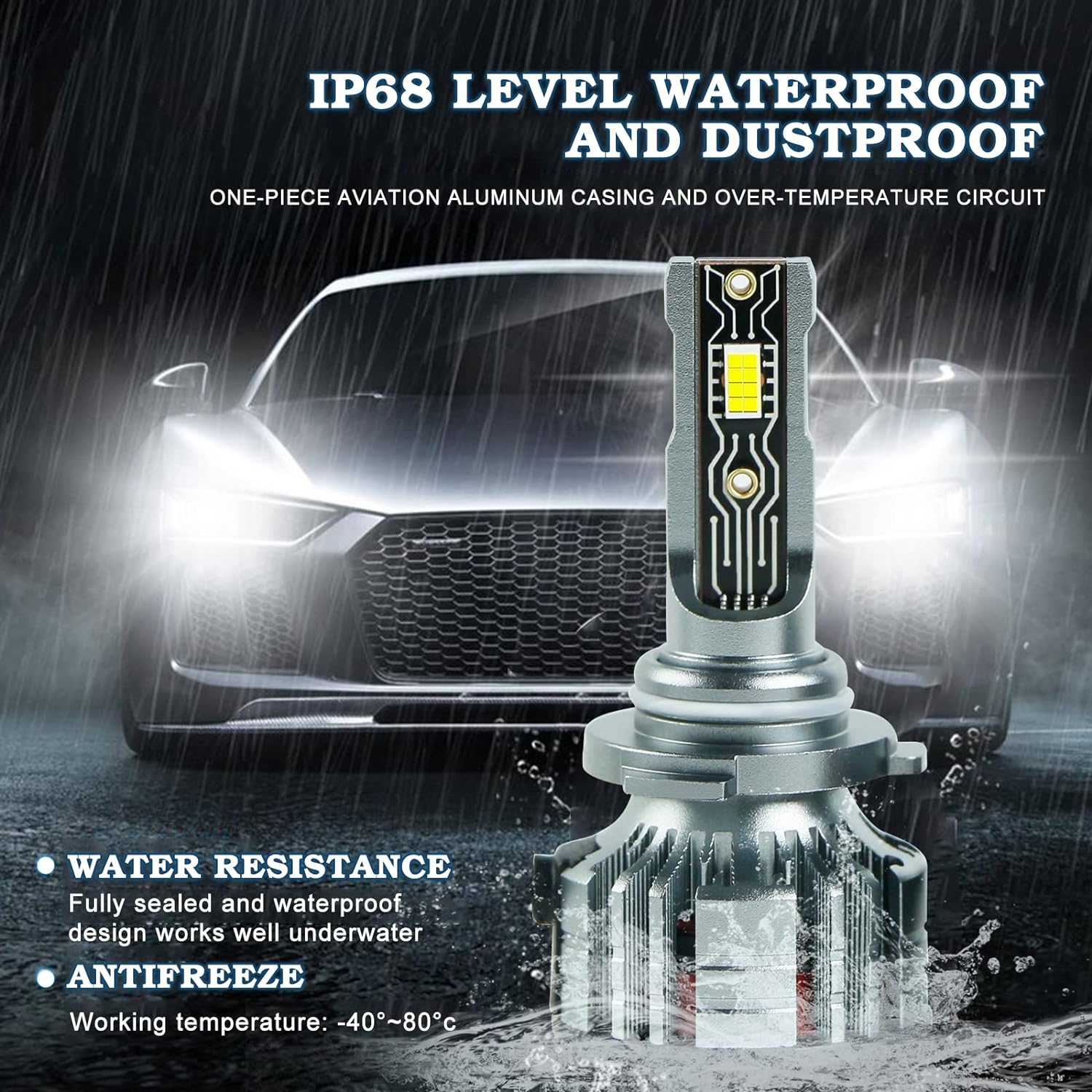 No fear of extremely weather. IP68 waterproof level makes the LED headlights performed well in any poor conditions. Super durability in rainy day, foggy day, snowy day,etc.